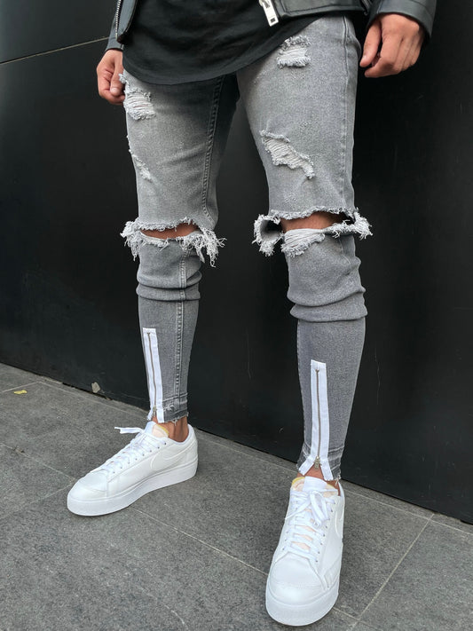 Grey Ripped Zipper Jeans