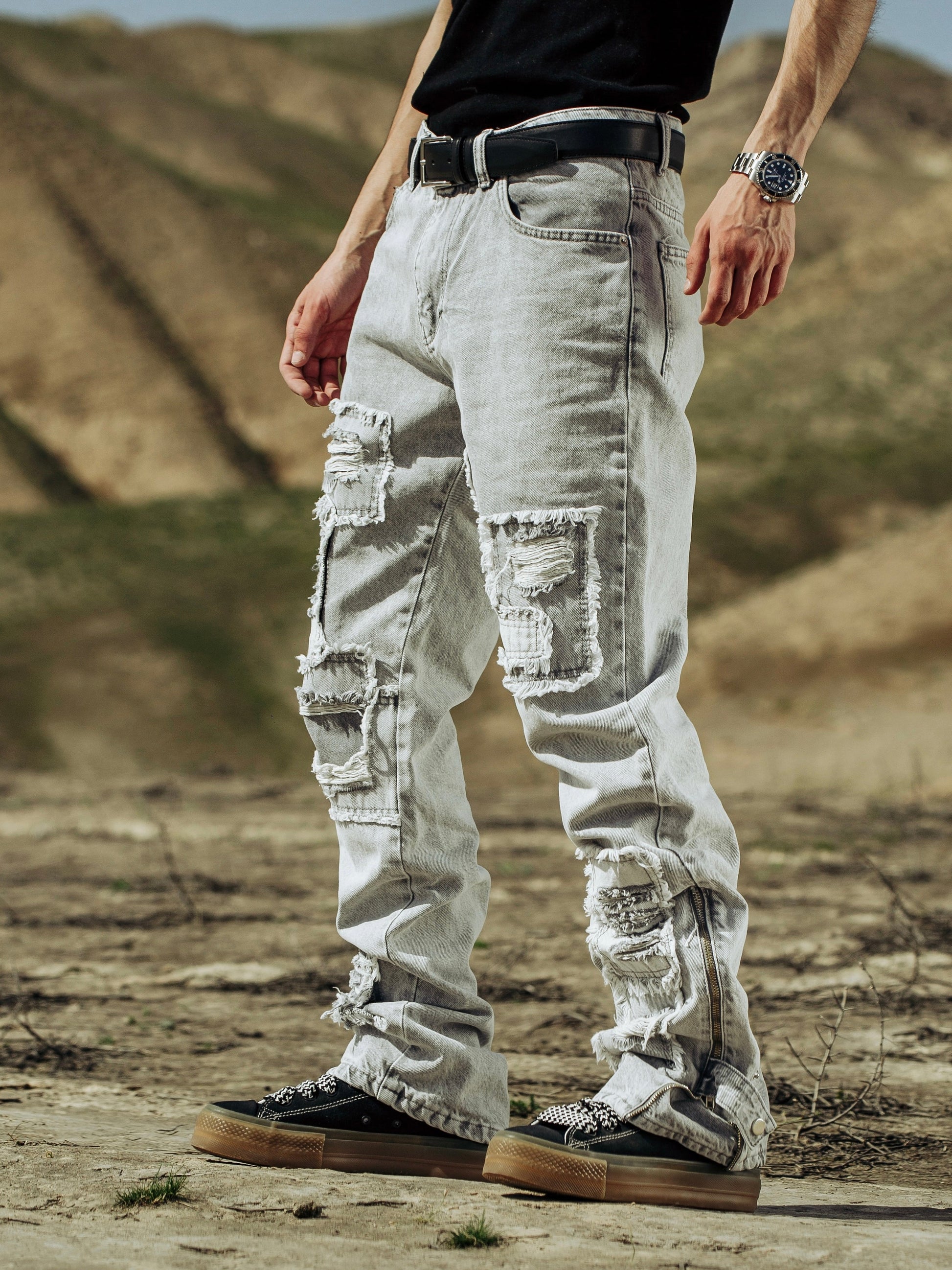 Grey Distressed Side Zip Jeans